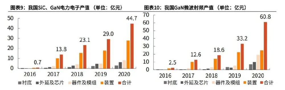 碳化硅(SiC) 氮化鎵(GaN) 除SiC、GaN外,第三代半導(dǎo)體還包括眾多其他材料,包括III族氮化物(AlN、InGaN、InAlN、AlGaN、AlInGaN等)、氧化物半導(dǎo)體(包括ZnO, CaTiO3, IGZO, β-Ga2O3 ,TiO2)以及金剛石半導(dǎo)體等。碳化硅基氮化鎵技術(shù)開始的,它在20多年前即已推出,現(xiàn)已成為RF功率應(yīng)用方面LDMOS和GaAs的有力競爭者。碳化硅基、氮化鎵打頭,硅基氮化鎵緊跟,硅基氮化鎵除了軍用雷達(dá)領(lǐng)域的深度滲透,它還是華為、諾基亞、三星等電信原始設(shè)備制造商(OEM)5G大規(guī)模MIMO基礎(chǔ)設(shè)施的首選。 增速方面,第三代半導(dǎo)體在功率器件的增速和體量都要大于微波射頻。微波領(lǐng)域在2020年已經(jīng)達(dá)到頂峰,因?yàn)?G建設(shè)的放緩,今年可能會(huì)有所下滑。故此推測,第三代半導(dǎo)體真正的應(yīng)用領(lǐng)域還是在功率器件或者電力電子器件,市場滲透主要包括新能源汽車和光伏逆變器。 第三代半導(dǎo)體仍是個(gè)新興技術(shù),全球市場處于初期階段。第三代半導(dǎo)體產(chǎn)業(yè)鏈主要包含襯底、外延材料、器件設(shè)計(jì)、制造、模塊和應(yīng)用這幾個(gè)環(huán)節(jié)。外延與器件設(shè)計(jì)方面,由于技術(shù)相對(duì)簡單,門檻不高,目前國內(nèi)外差距較??;而器件制造則是另一個(gè)差距較大的方面,國外由于發(fā)展較早,在制造的過程中累積了大量的產(chǎn)業(yè),其產(chǎn)品擁有較高的良率和可靠性。 國內(nèi)第三代半導(dǎo)體器件已經(jīng)迅速進(jìn)入了新能源汽車、光伏逆變、5G 基站、PD 快充等應(yīng)用領(lǐng)域,碳化硅主要應(yīng)用在新能源汽車和工控等領(lǐng)域,氮化鎵器件主要應(yīng)用在5G基站等領(lǐng)域。2020 年我國第三代半導(dǎo)體產(chǎn)業(yè)電力電子和射頻電子總產(chǎn)值超過 100 億元,同比增長 69.5%。其中,SiC、GaN 電力電子產(chǎn)值規(guī)模達(dá) 44.7 億元,同比增長 54%;GaN 微波射頻產(chǎn)值達(dá)到 60.8億元,同比增長 80.3%。